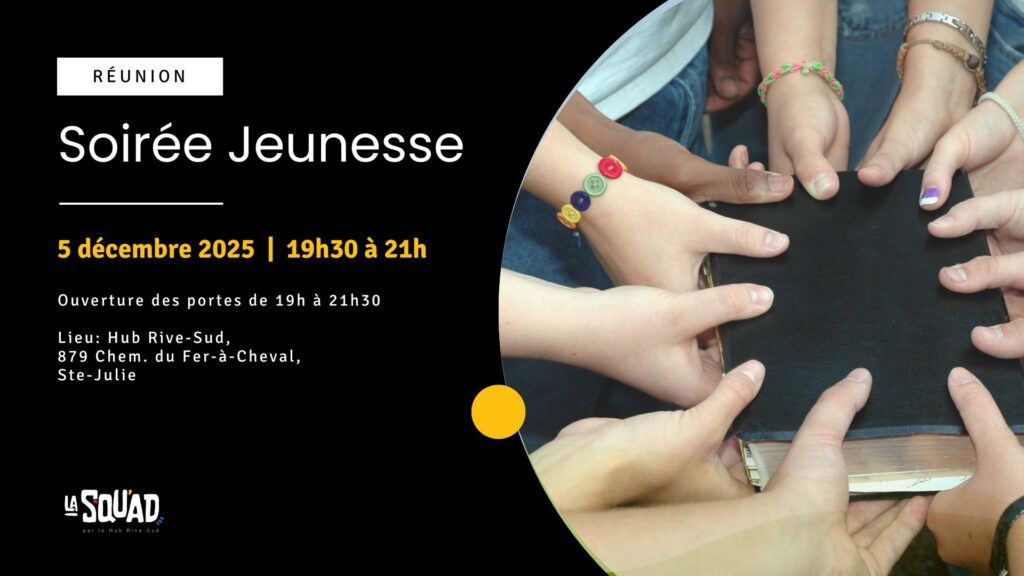 Participez à des événements qui illuminent des vies Rencontres publiques du dimanche Rencontres des groupes spécifiques Rencontres publiques de semaine mercredi 3 décembre Apprentis du chemin 879, Chemin du Fer-à-Cheval, Sainte-Julie, (QC) J3E 1X5 vendredi 5 décembre Rencontre SQUAD 879, Chemin du Fer-à-Cheval, Sainte-Julie, (QC) J3E 1X5 dimanche 7 décembre Rencontre du dimanche APPRENTIS DU CHEMIN 879, Chemin du Fer-à-Cheval, Sainte-Julie, (QC) J3E 1X5 Écouter en ligne dimanche 14 décembre Rencontre du dimanche conférencier : Philippe joret 879, Chemin du Fer-à-Cheval, Sainte-Julie, (QC) J3E 1X5 Écouter en ligne dimanche 14 décembre Rencontre ALPHA 879, Chemin du Fer-à-Cheval, Sainte-Julie, (QC) J3E 1X5 vendredi 19 décembre Rencontre SQUAD PARTY DE NOËL 879, Chemin du Fer-à-Cheval, Sainte-Julie, (QC) J3E 1X5 dimanche 21 décembre Rencontre du dimanche conférencier : DAVID RENAULT 879, Chemin du Fer-à-Cheval, Sainte-Julie, (QC) J3E 1X5 Écouter en ligne dimanche 28 décembre 4 janvier Pause - Temps des fêtes 879, Chemin du Fer-à-Cheval, Sainte-Julie, (QC) J3E 1X5